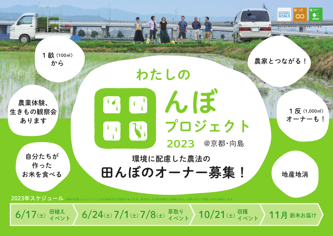- ・田んぼのオーナーを募集します。京都向島で、家族や仲間が食べる分のお米を自分たちで作りましょう。環境に配慮した田んぼで、田植え、草取り、収穫を体験していただけます。