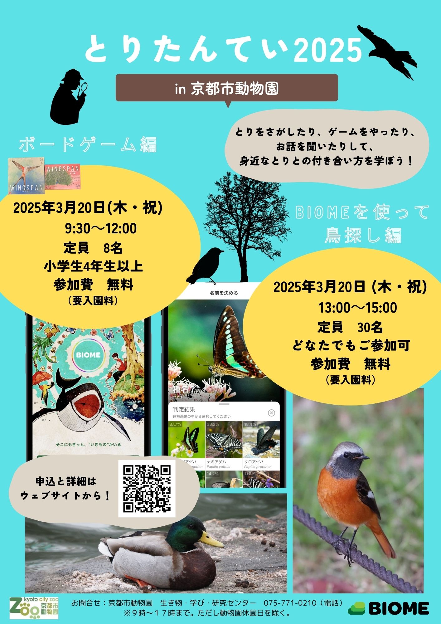 - この度、京都市動物園では、「とりたんてい2025」を開催をします。講演会、ボードゲームWingspanやいきものコレクションアプリ「Biome(バイオーム)」を利用して、身近ないきものやその守り方について考えるイベントです