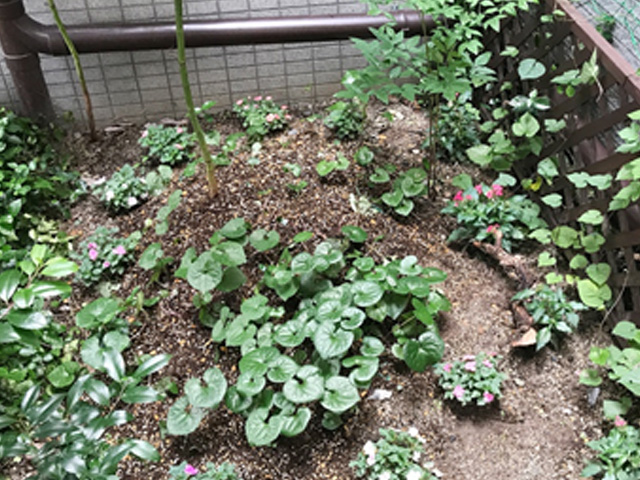 - 集合住宅共有スペースに適した保護植物(二葉葵)の植栽活動。