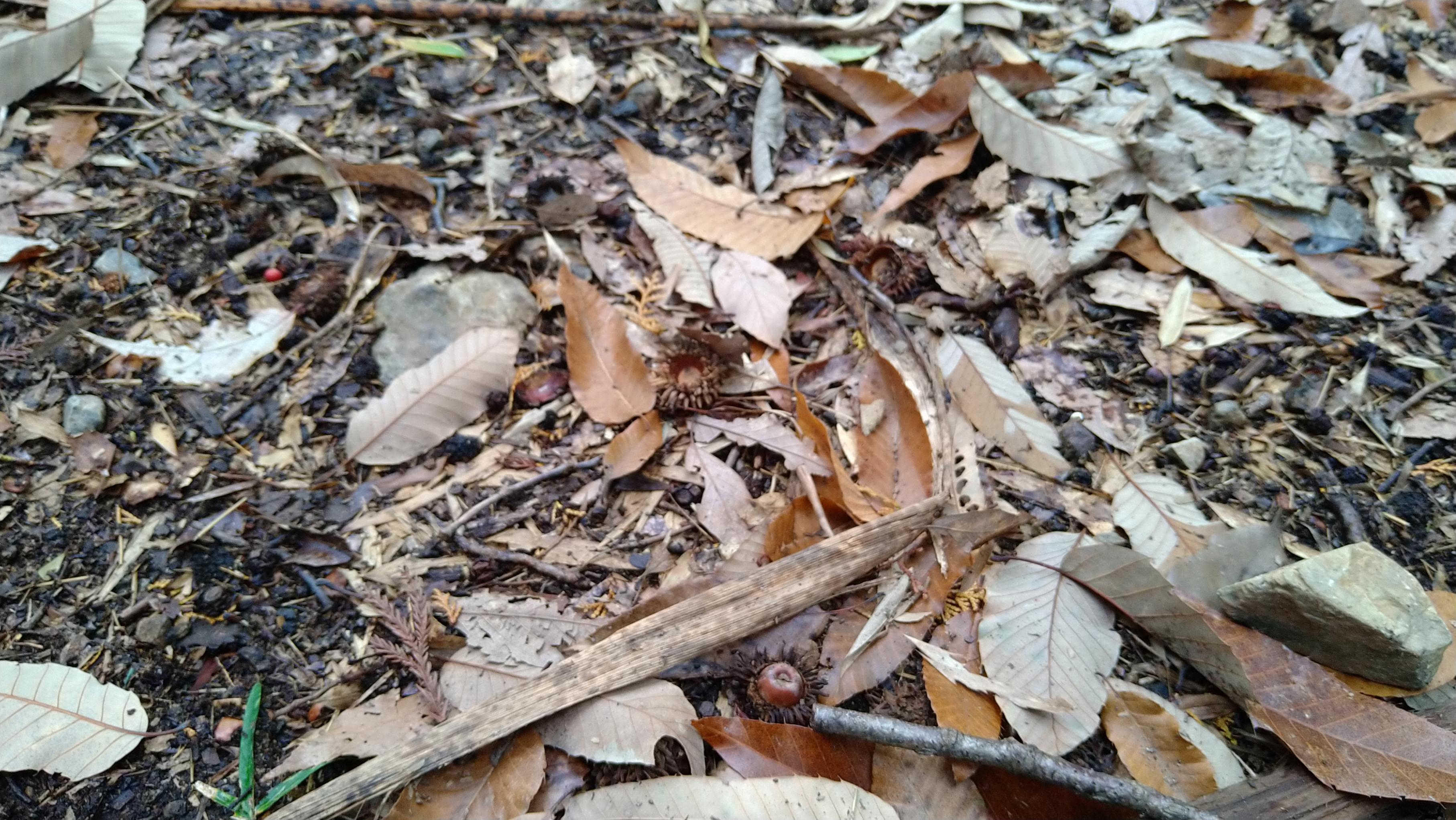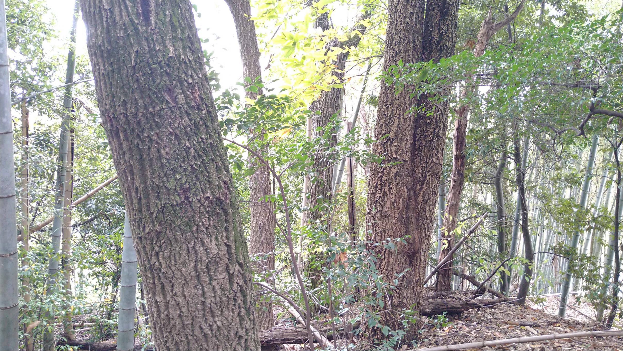 竹やヒノキの直線的な林の中で、異様な存在感がある