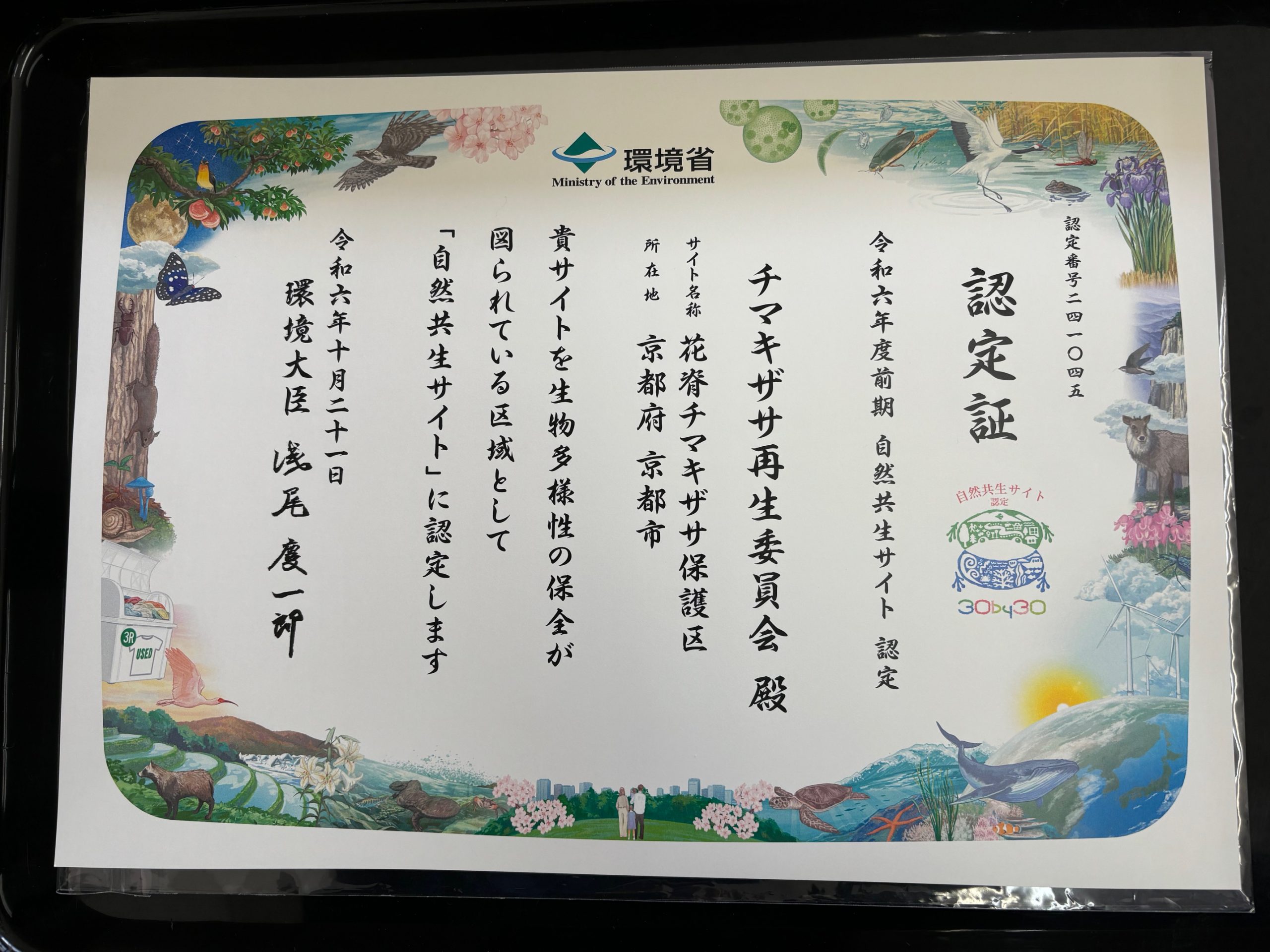 自然共生サイトの認定証