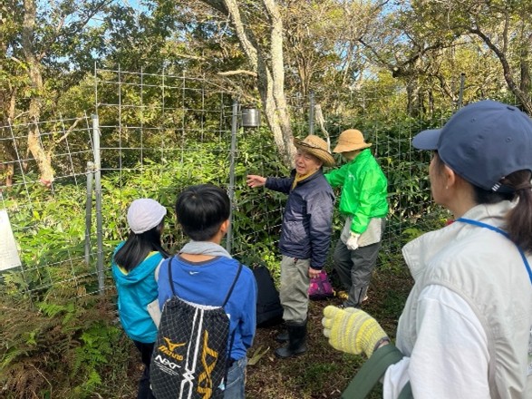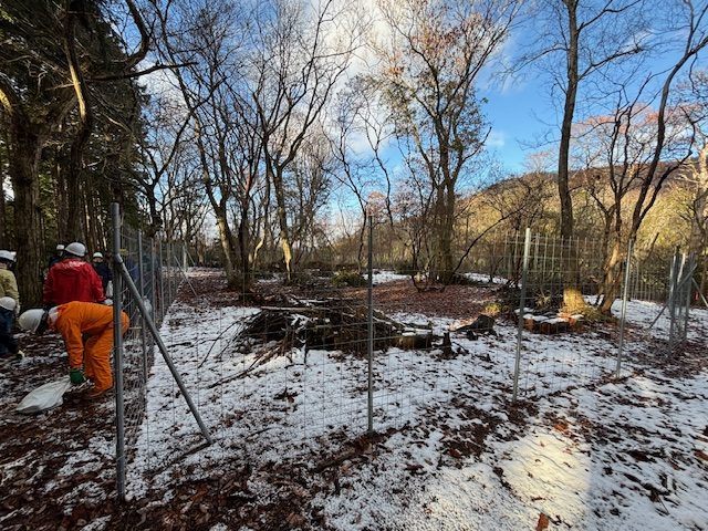 除伐等により環境を整えた後、シカの侵入を防ぐ防鹿柵を新たに設置し、防鹿柵外に自生している小さなササ苗を柵内に移植するとともに、防鹿柵に啓発看板の設置も行いました。