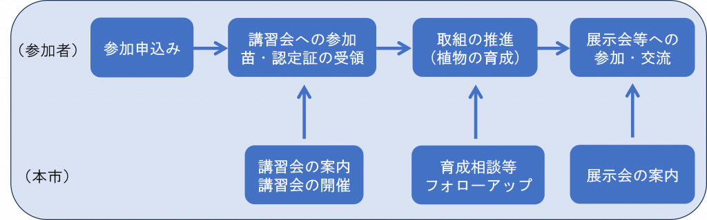 本制度の趣旨に御理解いただき、保全対象種※1のフタバアオイ、アヤメの栽培方法等に関する育成講習会を受講した市民の皆様に生息域外保全※2に取り組んでいただきます。
