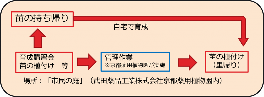 武田薬品工業㈱京都薬用植物園が用意する植物の苗を自宅に持ち帰り、御自宅で育成に挑戦していただきます。なお、お持ち帰りいただく苗は、今回「市民の庭」に植え付けるものと一部異なる場合があります。